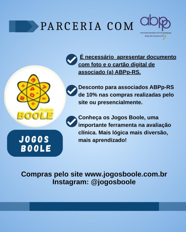 Jogos Boole - conheça essa importante ferramenta na avaliação clínica. Lógica e diversão! Desconto de 10% para associados(as) da ABPp-RS nas compras realizadas pelo site.