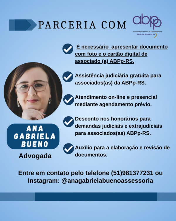 Assistência judiciária gratuita para associados(as) da ABPp-RS; atendimento presencial e on-line mediante agendamento prévio; desconto para associados(as) da ABPp-RS nos honorários para demandas judiciais e extrajudiciais; auxílio para a elaboração de revisão de documentos. Contato pelo WhatsApp (51) 981377231