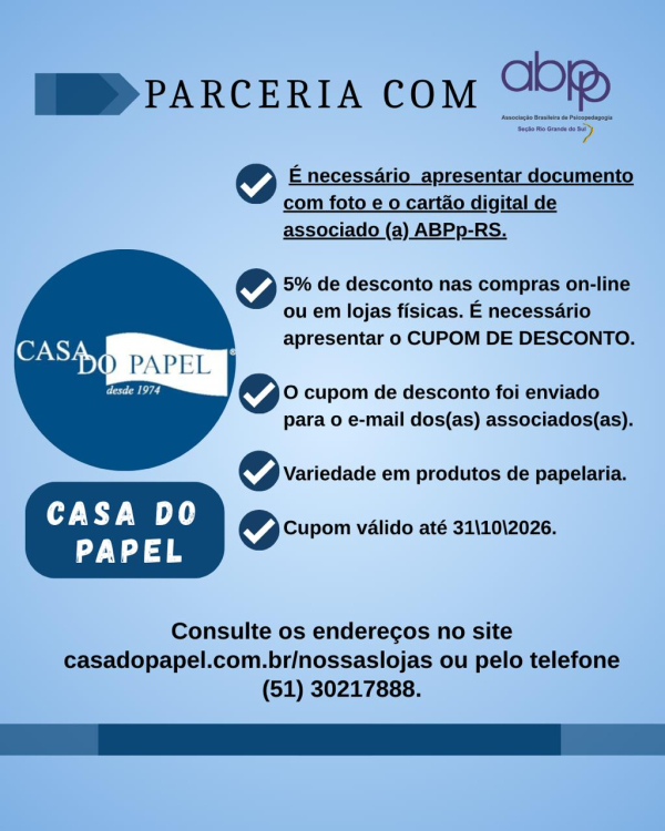 Casa do Papel - 5% de desconto para associados(as) da ABPp-RS nas compras on-line ou em lojas físicas, é necessário apresentar o CUPOM DE DESCONTO. que foi enviado para os associados adimplentes em 2025.