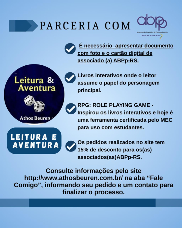 Leitura & Aventura- RPG(Role Playing Game) - inspirou os livros interativos e, atualmente, é uma ferramenta certificada pelo MEC para uso com estudantes; Livros interativos em que o leitor assume o papel do personagem principal. 15% de desconto para associados(as) da ABPp-RS nos pedidos realizados no site (informações na aba "Fale Comigo" .